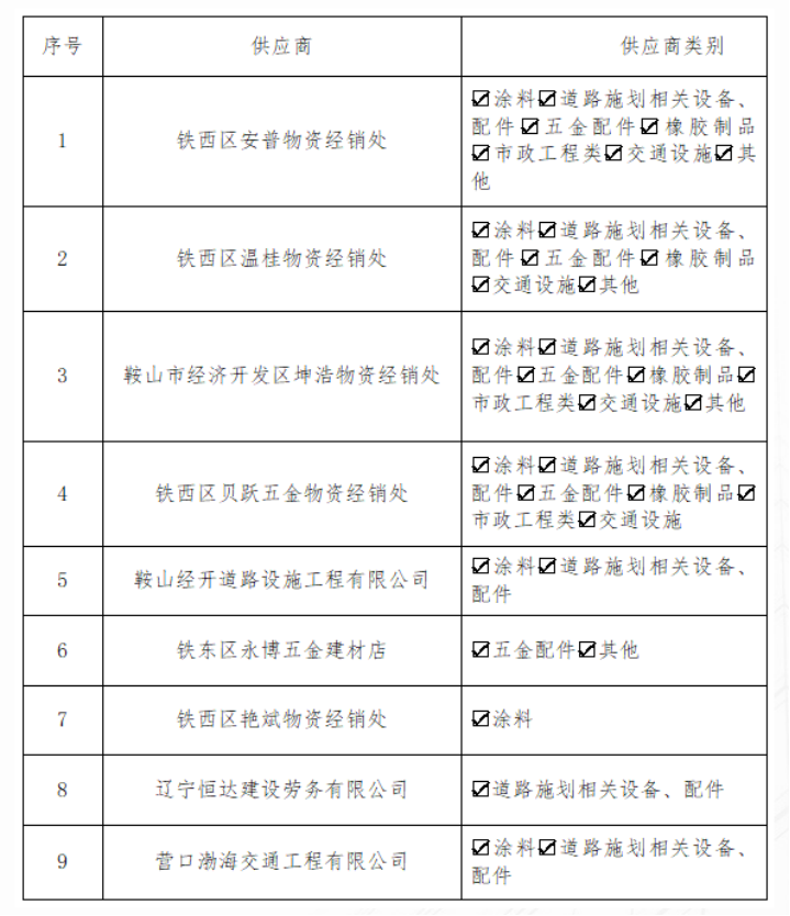 供應商入庫名單公告根據2024年5月11日發布的《供應商入庫公告》要求,經過報名篩選和資質審查等程序,確定6家供應商符合入庫條件。現公布經過篩選的供應商入庫清單,名單如下:序號供應商供應商類別1經濟開發區世能電氣商行?涂料?道路施劃相關設備?市政工程?其他2鐵西區君龍威裝飾材料商行?涂料?市政工程?其他3鞍山經